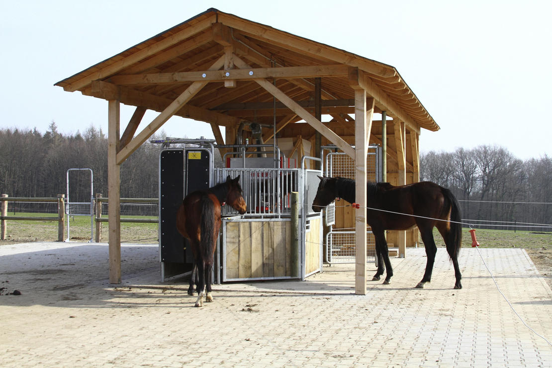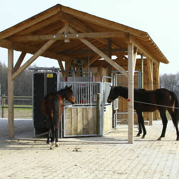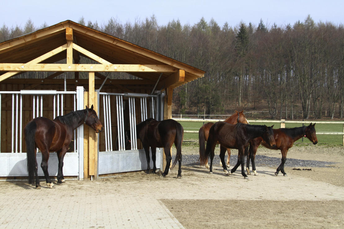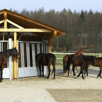 Bewegungsstall: Ein Aktivstall ist eigentlich kein Stall, sondern ein Park. In der Natur bewegen sich Pferde den ganzen Tag in ruhigem Tempo, ihre großen Lungen brauchen die frische Luft, sie fressen nahezu ständig kleine Mengen und leben rund um das Jahr im Herdenverband unter freiem Himmel. An diese Lebensweise sind Pferde optimal angepasst. Sie hält sie gesund und fit, sowohl körperlich, als auch mental. Unsere Pferde sollen genau so leben und uns doch als leistungsbereite Freizeitpartner zur Verfügung stehen. Hochmoderne Fütterungstechnik und viel Platz machen es möglich: Auf einer Fläche von 4.500 m² lebt eine gemischte Herde. Die wichtigsten Funktionsbereiche wie Liegehallen, Kraft- und Raufutterstationen oder die Tränke sind so im Gelände verteilt, dass die Pferde auf dem Weg von einem zum nächsten Ziel weite Strecken zurücklegen. Steigungen, unterschiedliche Untergründe, Rückzugsräume und Ausweichmöglichkeiten ergeben sich durch die sorgfältige Gestaltung der Landschaft wie von selbst. Gönnen Sie Ihrem Pferd ein Leben unter Freunden und in maximaler Freiheit. Es wird gesund, glücklich und gelassen sein - sogar ohne Sie, wenn Sie mal keine Zeit haben.