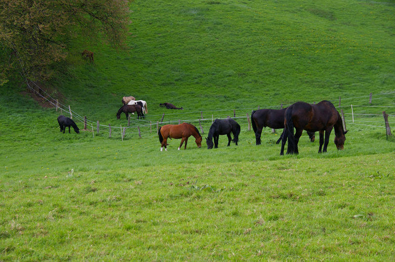 geräumige Offenställe mit Einzelfressständen zur stressfreien Futteraufnahme, frostfreie Frischwassertränke, direkter Auslauf zur Winterweide, ca. 8 ha Sommerweide, familiäre Atmosphäre. Auch Rentnerpferde. Beleuchteter Reitplatz