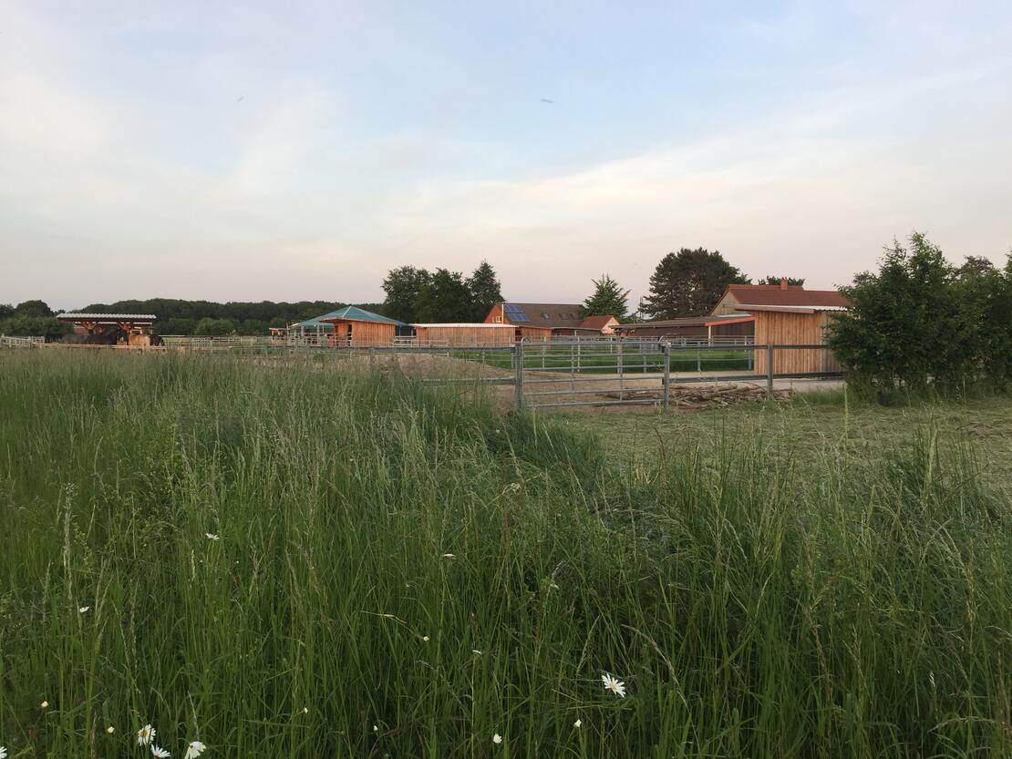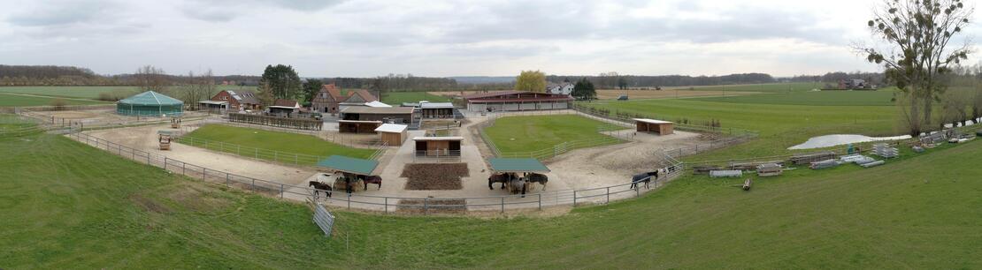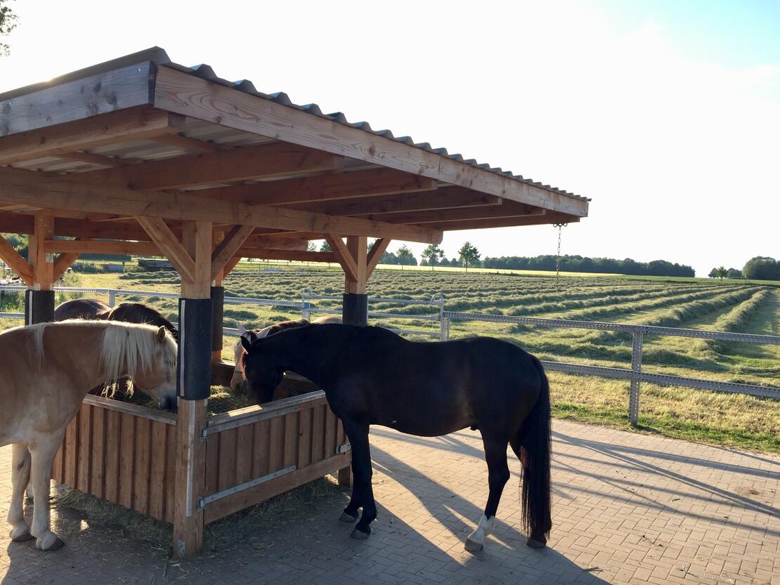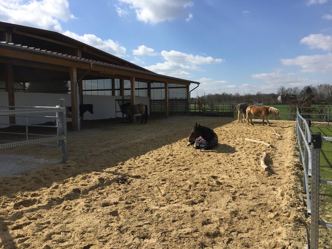 Pferde sind Lauf- und Fluchttiere und benötigen ihren Freiraum, um sich zu entfalten und gesund zu entwickeln. Unser LebensRaum DraußenPferd bietet ein in unserer Region einzigartiges Konzept der artgerechten Pferdehaltung nach dem Paddock-Trail Prinzip. Hier können Pferde ihrem natürlichen Bewegungsdrang nachgehen und einfach vitaler leben. Auf über 10.000 Quadratmetern ist eine reine Wallachgruppe beheimatet. Insgesamt stehen den Pferden ein über 600 Meter langes Wegenetz mit unterschiedlichen Bodenbeschaffenheiten zur Verfügung. Ergänzt wird das Angebot durch Weiden, Unterstände mit Liegebereichen, Spiel- und Wälzplätzen sowie abwechslungsreiche Möglichkeiten zur Nahrungsaufnahme. Überdachte Bewegungsflächen, wie Reithalle und Longierzelt, bieten Pferd und Reiter die gewünschte Unabhängigkeit bei schlechtem Wetter.
