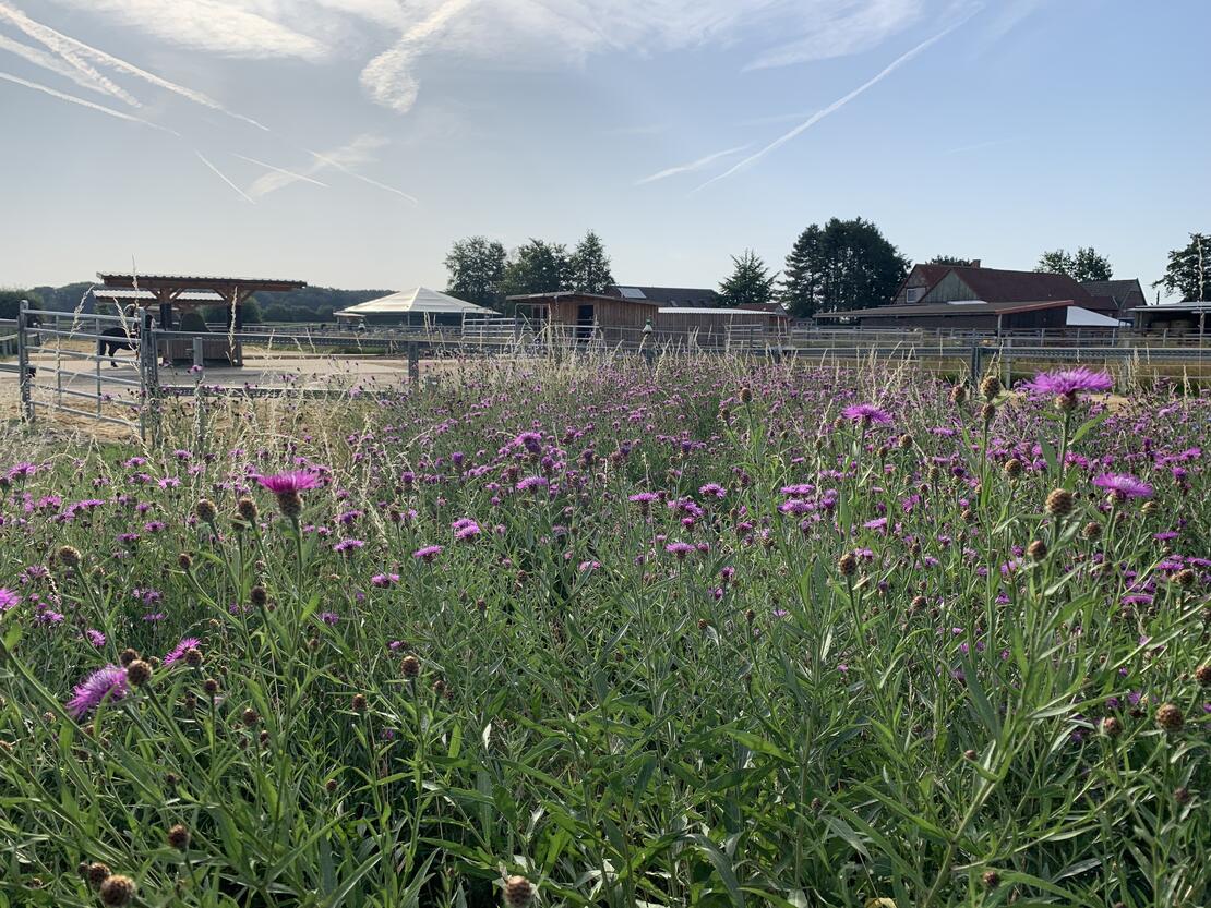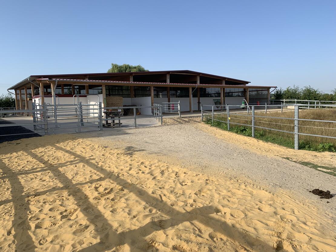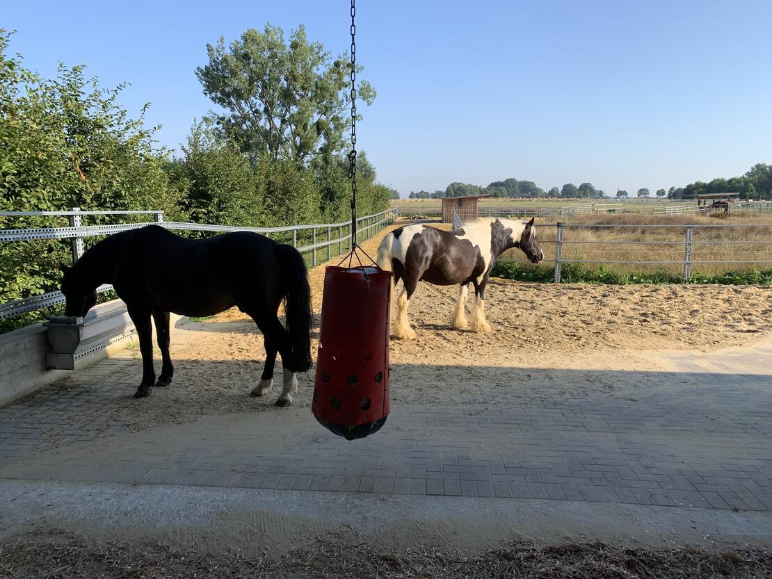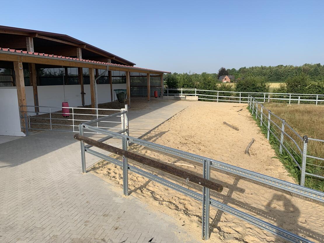 Pferde sind Lauf- und Fluchttiere und benötigen ihren Freiraum, um sich zu entfalten und gesund zu entwickeln. Unser LebensRaum DraußenPferd bietet ein in unserer Region einzigartiges Konzept der artgerechten Pferdehaltung nach dem Paddock-Trail Prinzip. Hier können Pferde ihrem natürlichen Bewegungsdrang nachgehen und einfach vitaler leben. Auf über 10.000 Quadratmetern ist eine reine Wallachgruppe beheimatet. Insgesamt stehen den Pferden ein über 600 Meter langes Wegenetz mit unterschiedlichen Bodenbeschaffenheiten zur Verfügung. Ergänzt wird das Angebot durch Weiden, Unterstände mit Liegebereichen, Spiel- und Wälzplätzen sowie abwechslungsreiche Möglichkeiten zur Nahrungsaufnahme. Überdachte Bewegungsflächen, wie Reithalle und Longierzelt, bieten Pferd und Reiter die gewünschte Unabhängigkeit bei schlechtem Wetter.