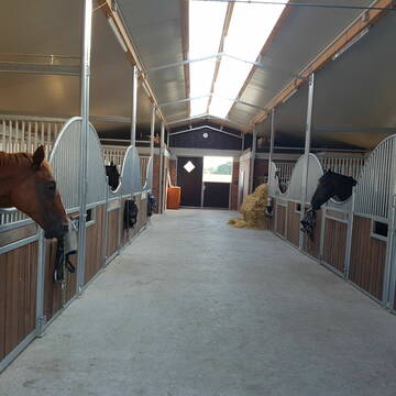 - Ein Offenstall für zwei Pferde mit Lamellen als Fliegen- und Windschutz