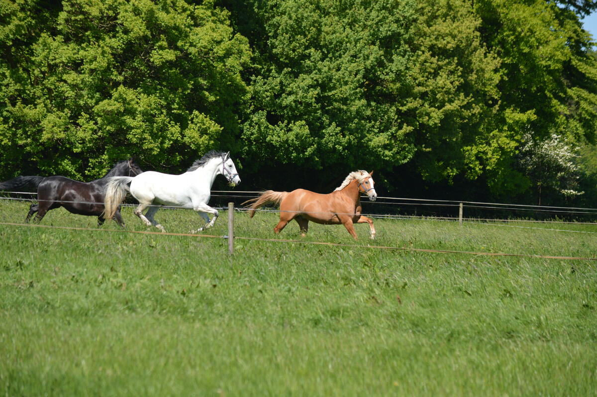Rund 260.000 m² Weidefläche direkt am Hof lassen Pferdeherzen höherschlagen. In Gruppen von 5–10 Pferden – oder in ihren Offenstallgruppen – genießen sie von Mai bis November ganztägig das saftige Grün. In den Wintermonaten (November–April) sorgen unsere großzügigen Sandpaddocks und Offenstallausläufe dafür, dass Bewegung und Sozialkontakte auch in dieser Zeit nicht zu kurz kommen.