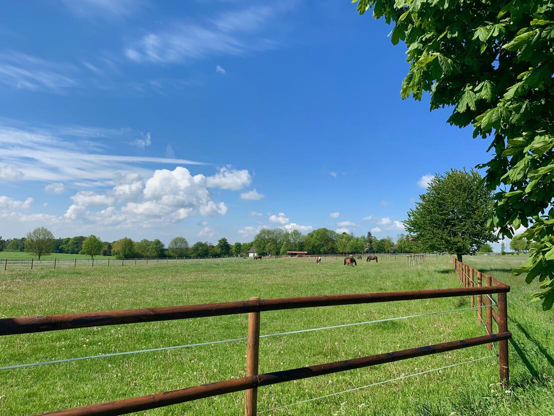 Auf unserem Gelände verfügen wir für jedes Pferd über eigene, 1, 50 Meter hohe holzeingezäunte Weiden.