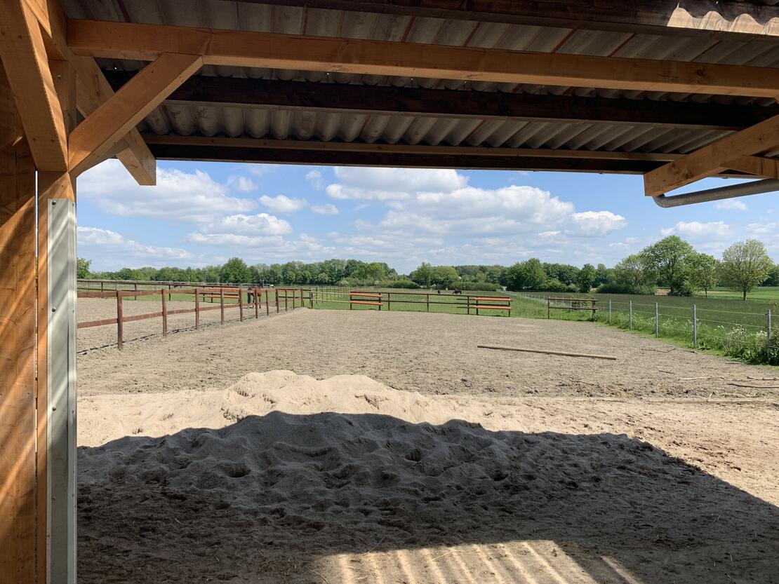 Offenstallplatzzwei große ebene Weideflächen zur Wechselbeweidung, großer überdachter Unterstand angrenzend an offene Laufboxen, Raufutterraufe, Selbsttränke |