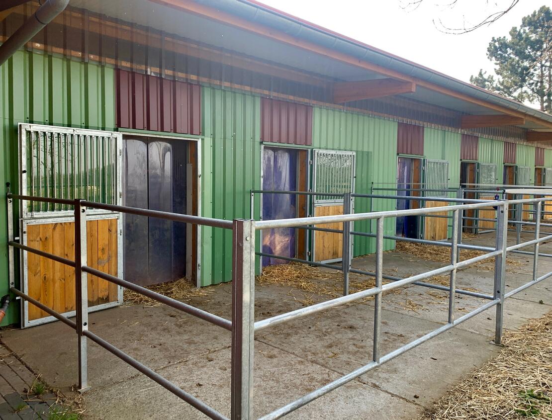Außenbox mit eigenem PaddockVollpension, dreimal tägliches Füttern, eigene Weide, gegen Aufpreis Mist- und Weideservice zubuchbar |
