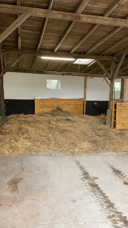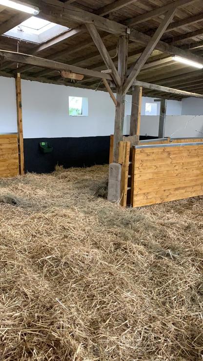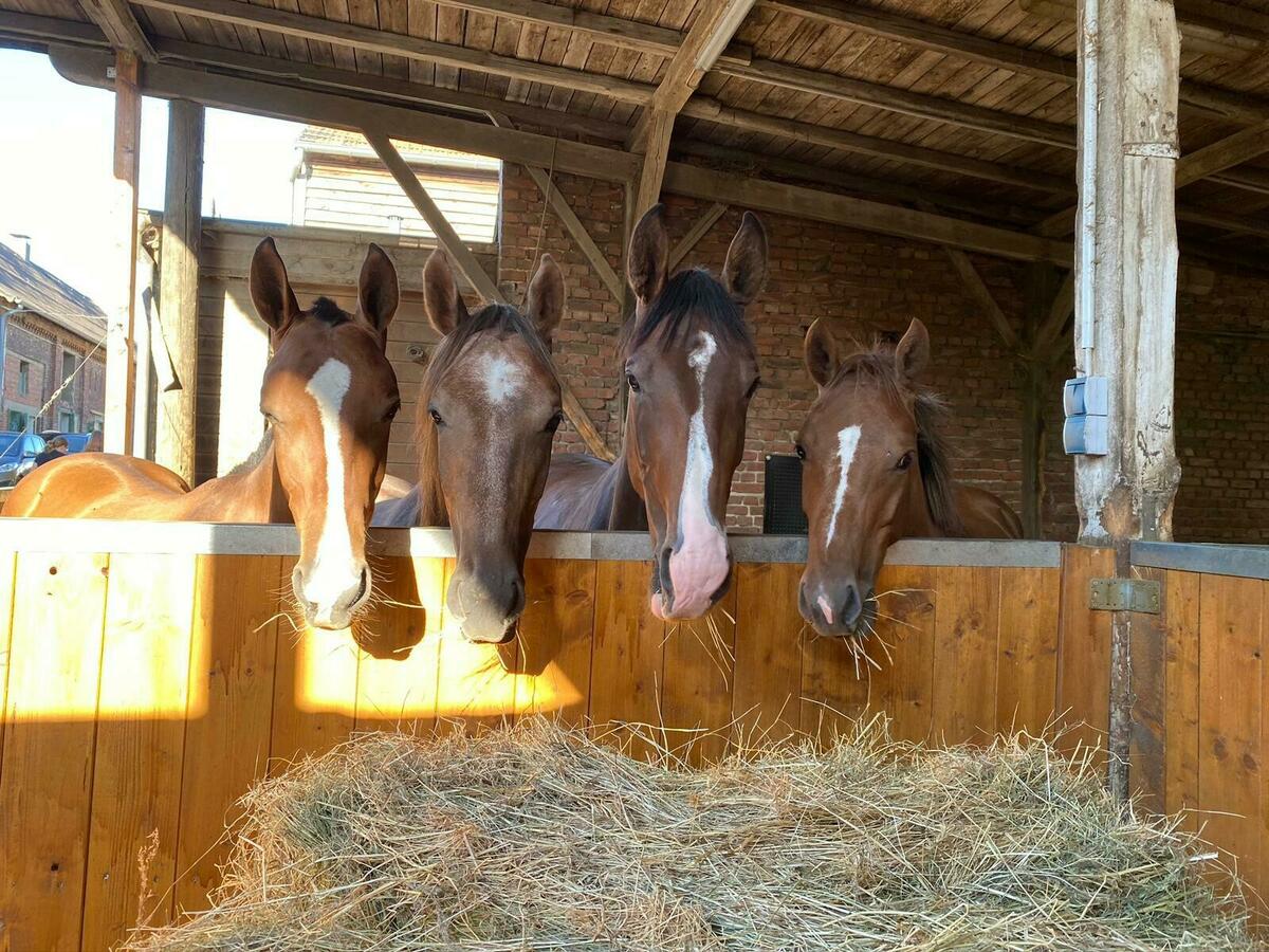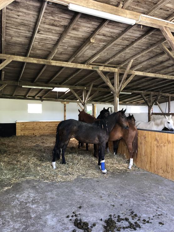 Unsere Fohlen kommen Sommer wie Winter tagsüber auf die Wiese. Den Abend und die Nacht verbringt die Herde in unserem Laufstall. Dort gibt es genügend Heu und Stroh. Bei uns lernen die Fohlen am Halfter zu laufen, auch der Schmied und Tierarztbesuch wird von uns begleitet.
