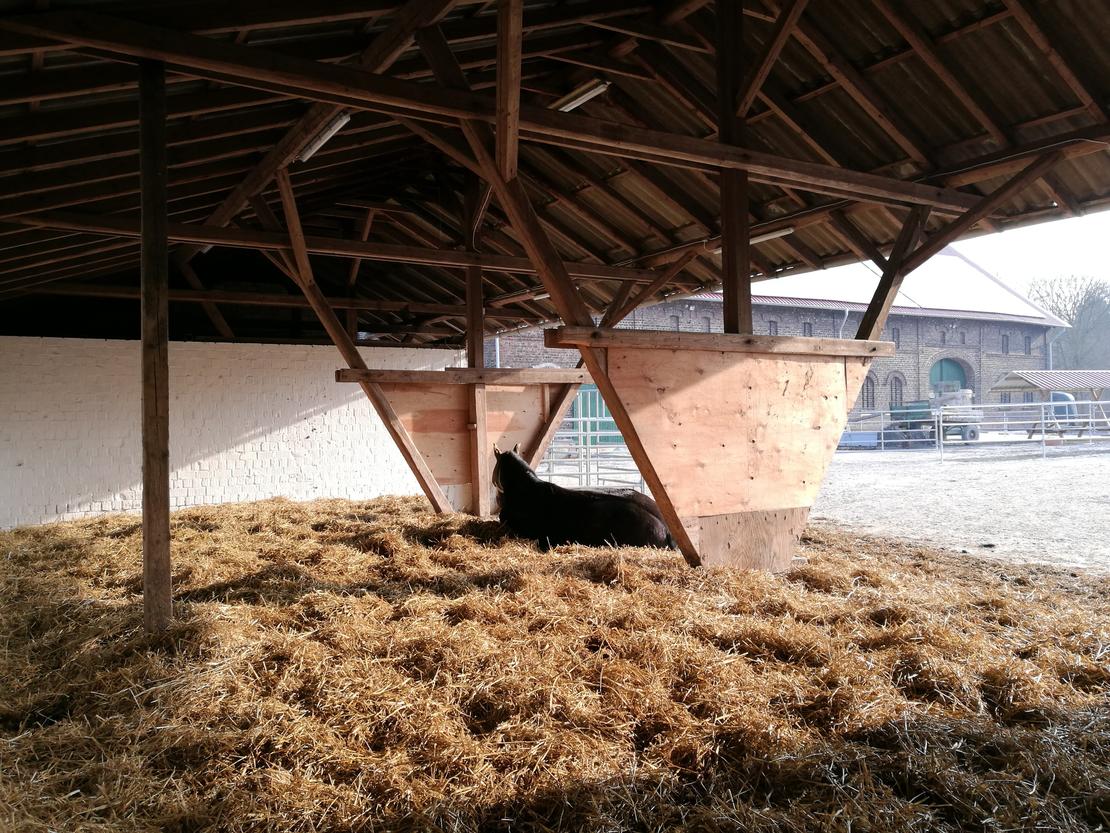 Die Liegeflächen werden mit Stroh eingestreut, so dass immer eine weiche verformbare Liegefläche zur Verfügung steht und die Pferde bequem liegen können und auch ihr Kaubedürfnis immer befriedigen können.