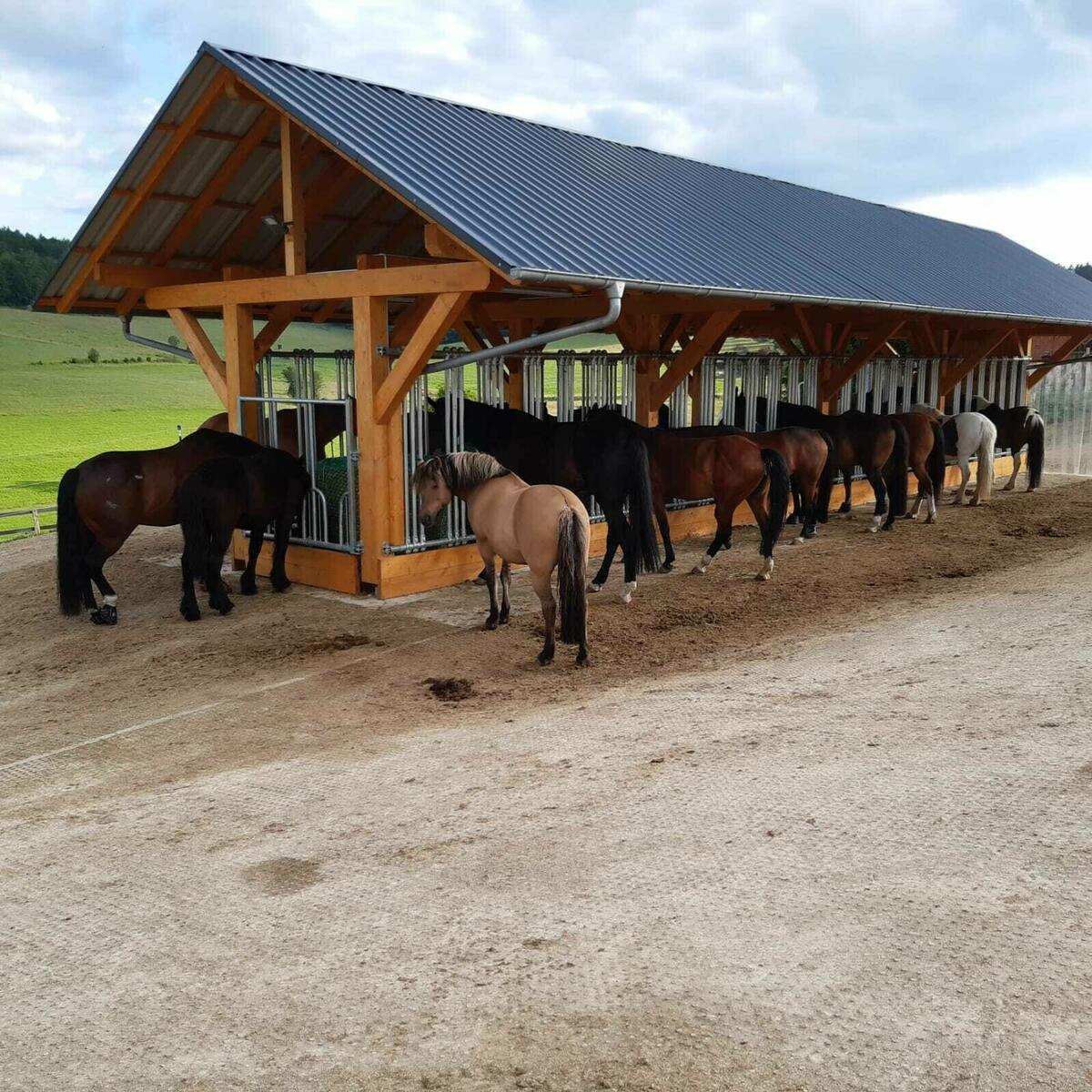Die Heuraufen haben eine großzügige Überdachung, sodass die Pferde komplett geschützt vor Regen, oder starker Sonneneinstrahlung fressen können!