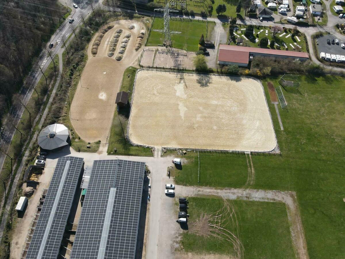 Longierhalle (Ø 15m) mit Bewässerungsanlage und einer Photovoltaik-Anlage.