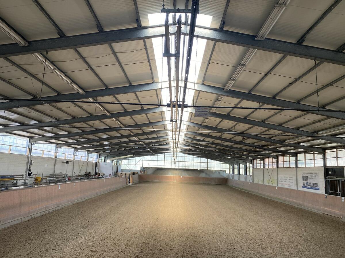 Zusätzlich besitzen wir eine moderne Longierhalle, mit optimaler Belüftung, sehr gutem Reithallenboden und einer Beregnungsanlage. Die Longierhalle ist komplett in Gummi ausgekleidet, so dass die Pferde entspannt, sicher und ohne Verletzungsgefahr freilaufen können. Für eine gute Longierarbeit der Pferde ist sie hervorragend geeignet.