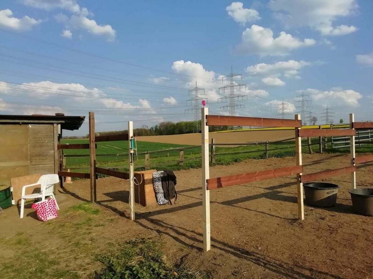 Es gibt in einem kleinen separaten Stalltrakt 3 kleinere Innenboxen (für Ponys/Pferde bis 1,55m) und 2 Paddockboxen.