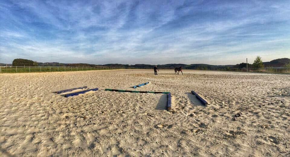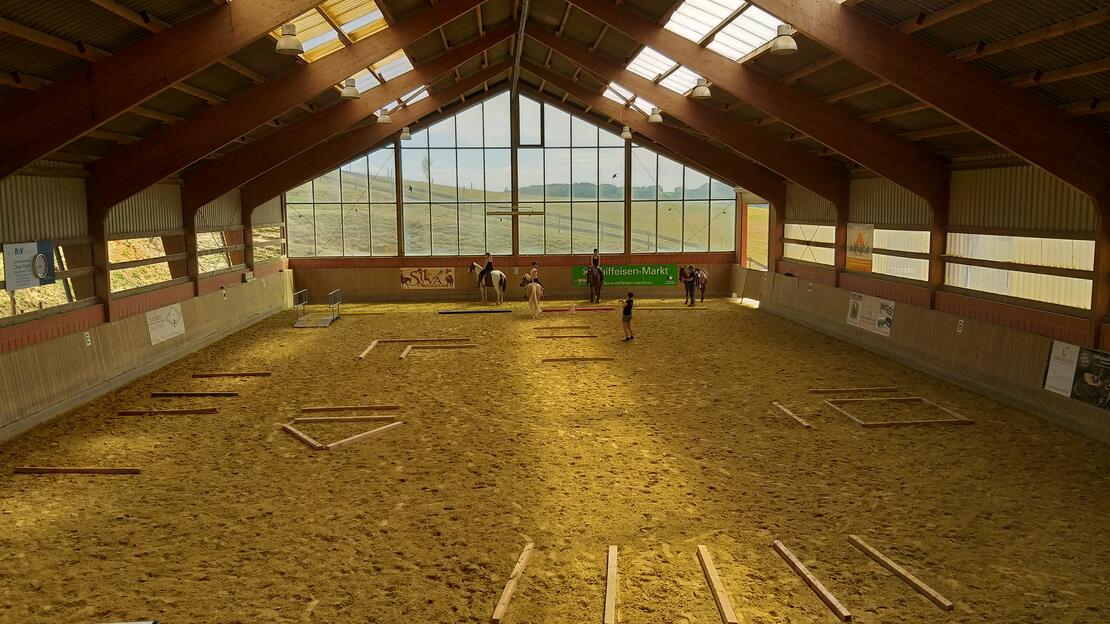Unsere großzügige Anlage verfügt über 2 helle und luftige Stallgassen, einen separaten Offenstall, einen Laufstall, eine lichtdurchflutete 20x40 m große Reithalle mit Reiningboden, einen 40x80 m großen Außenreitplatz mit Beleuchtung, einen Roundpen, über 30 ha Weidefläche, Waschplätze (innen und außen), Solarium, Reiterstübchen/Saloon, Grillplatz, Sattelkammer, Seminarraum und Ferienapartments. Am Ortsrand von Kürten und Lindlar gelegen - ruhig aber dennoch zentral, mit guter Anbindung zur Autobahn A4 und atemberaubendem Panoramablick über Wiesen und Wälder.