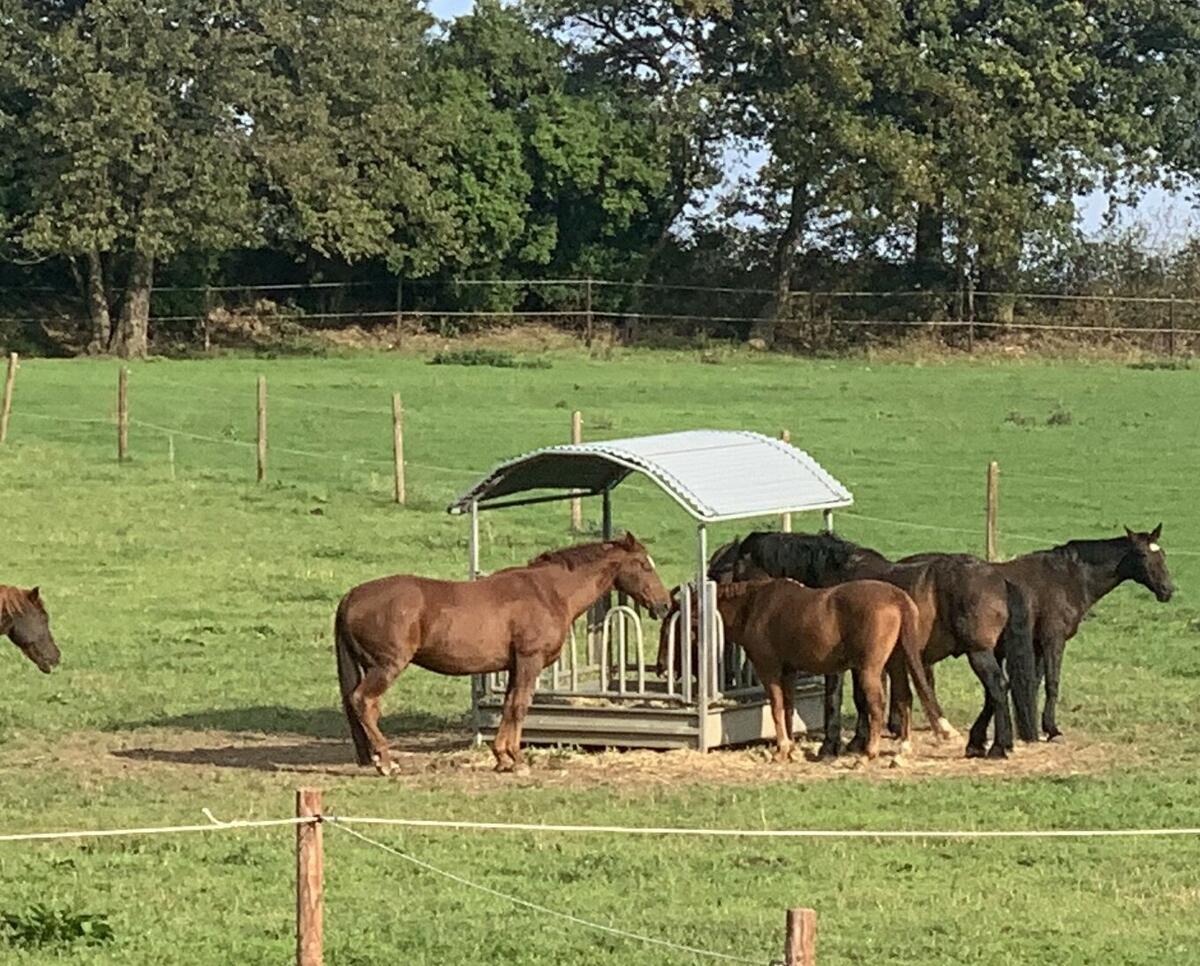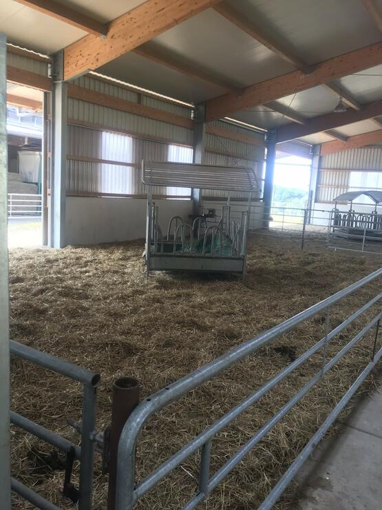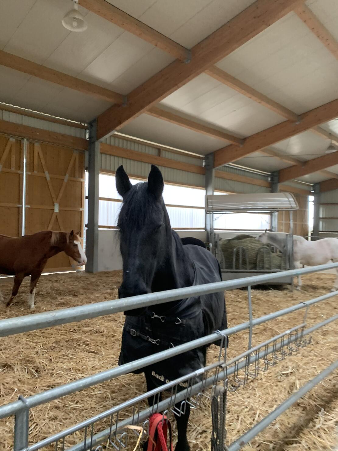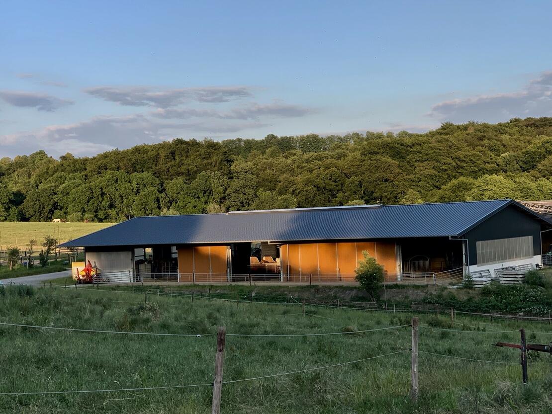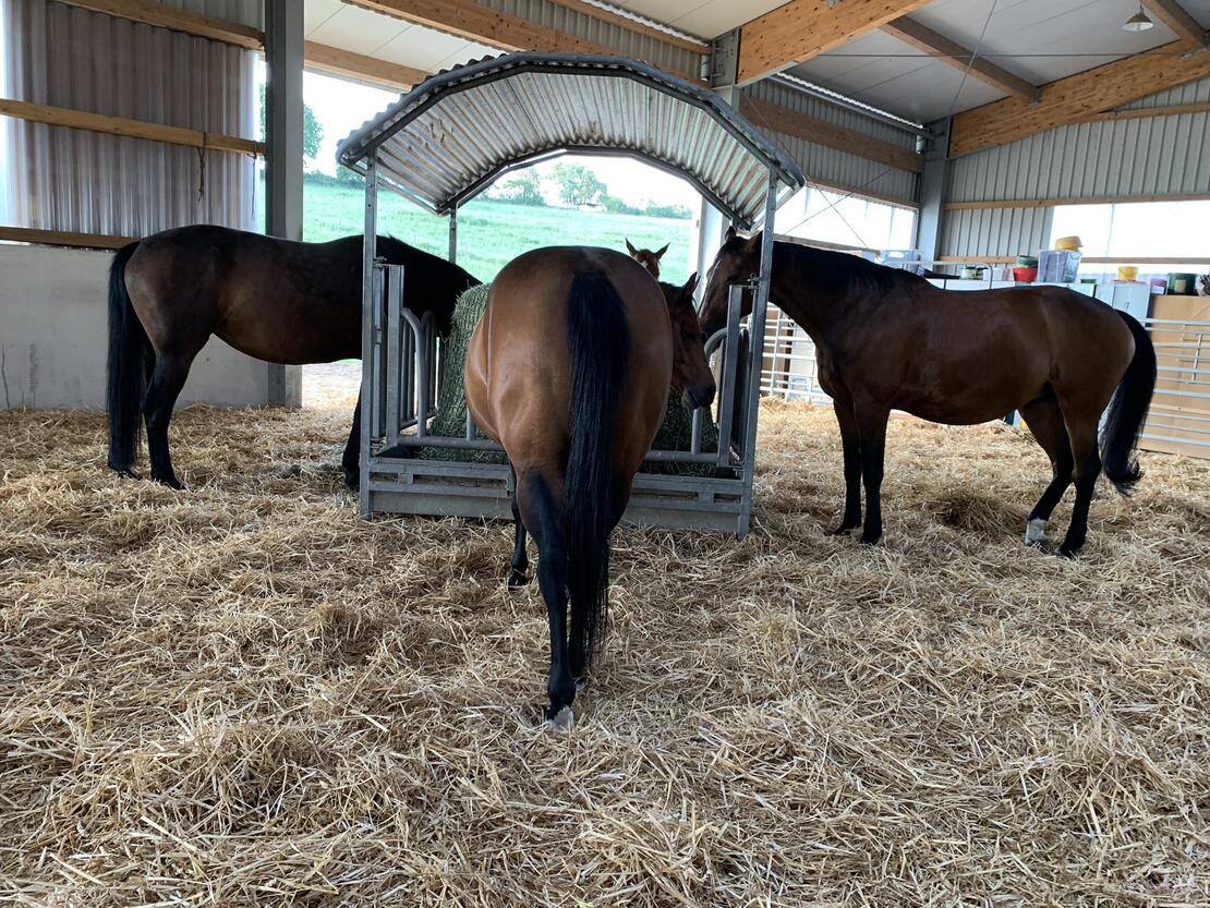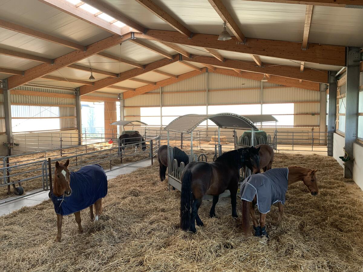Wir haben für unsere Pensionsgäste eine große, Halle errichtet, die in Parzellen für Gruppen von jeweils 4-5 Pferden vorgesehen sind. Jede Gruppe verfügt über eine eigene Ballenraufe, wo sich jedes Pferd 24 Stunden frei bedienen kann. Wir verfüttern unser eigenes Heu, bei dem wir kompromisslos Wert auf eine hohe Qualität legen. Jede Parzelle hat einen mit Sand ausgelegten Auslauf, der jedoch noch unter dem vorspringenden Hallendach liegt und so die Pferde trotz des Auslaufs wettergeschützt sind.
