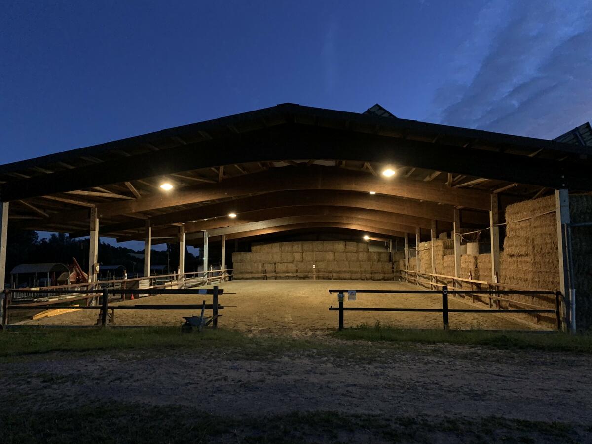 Die Reithalle ist 20 x 40m groß und wird regelmäßig abgezogen. Wenn Sie mit Ihrem Pferd Bodenarbeit machen möchten, longieren oder unter dem Sattel arbeiten wollen, stehen Ihnen weiterhin noch ein beleuchteter Roundpen und ein 20 x 50m großer Außenplatz zur Verfügung. Ab Mai bis Oktober bieten wir Weidegang auf unseren großzügigen Koppeln an. Die Flächen sind groß, dass die Pferde im Sommer auch ganztägig draußen bleiben können. Zusätzlich bekommen die Pferde auch auf den Wiesen Heu in Futterraufen.