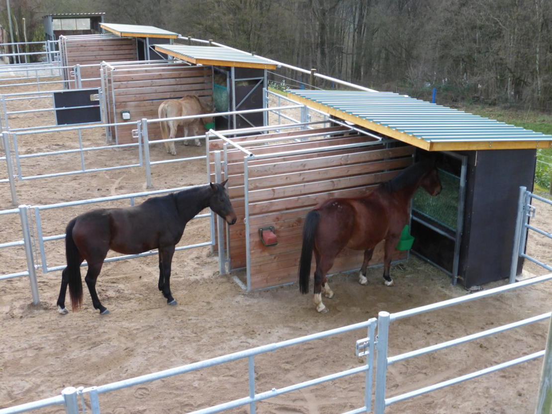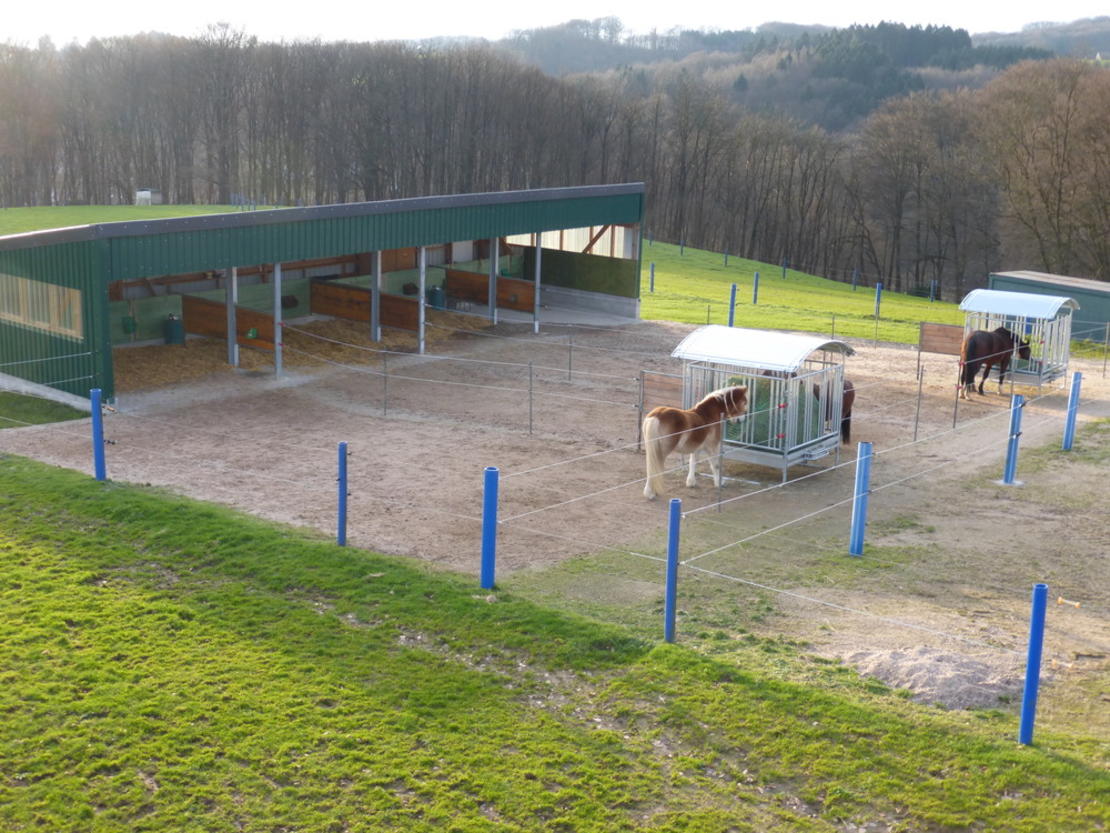 Gepflegter Pensionsbetrieb in ruhiger Lage (zwischen Untereschbach und Schmitzhöhe), mit guter Ausstattung. Unsere jahrelange Erfahrung und die Entwicklung in der Pferdehaltung haben uns bestätigt, dass der Weg den Pferden eine ganzjährige ausreichende Bewegung zu ermöglichen, der richtige ist. Aus diesem Grund haben wir unser Angebot mit Gruppenpaddocks durch eine neue Laufstallanlage (November 2013) ersetzt. Unsere Pferde stehen in Zweiergruppen. Diese Gruppenzusammenstellung ermöglicht eine individuelle Fütterung und die Möglichkeit, Ergänzungsfutter beizufüttern.