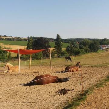 Unser gut zu erreichende Pferdepension im Grünen verfügt über eine hofeigene Reithalle (15x30m), einen beleuchteten Außenplatz (20x25m), ein Wärmesolarium, eine Pferdedusche, eine Sattelkammer, eine Solekammer und WC. 16 ha Weide und großzügige befestigte Winterpaddocks stehen den Pferden für den täglichen Auslauf zur Verfügung.
