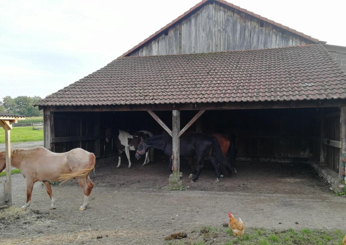 Im Sommer bleiben die Pferde ganztägig draußen. Es steht ein schattiger Unterstand zur Verfügung, so dass die Herde im Sommer Schutz vor der Sonne und im Winter Schutz vor schlechtem Wetter findet.