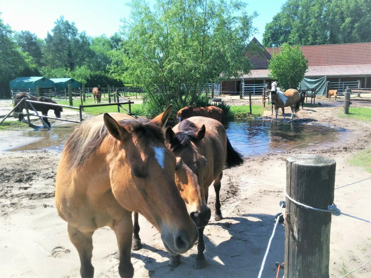 - Wasserloch, Hügel, Trail, verschiedene Böden (Sand, Erde, Pflasterung, Paddockplatten)