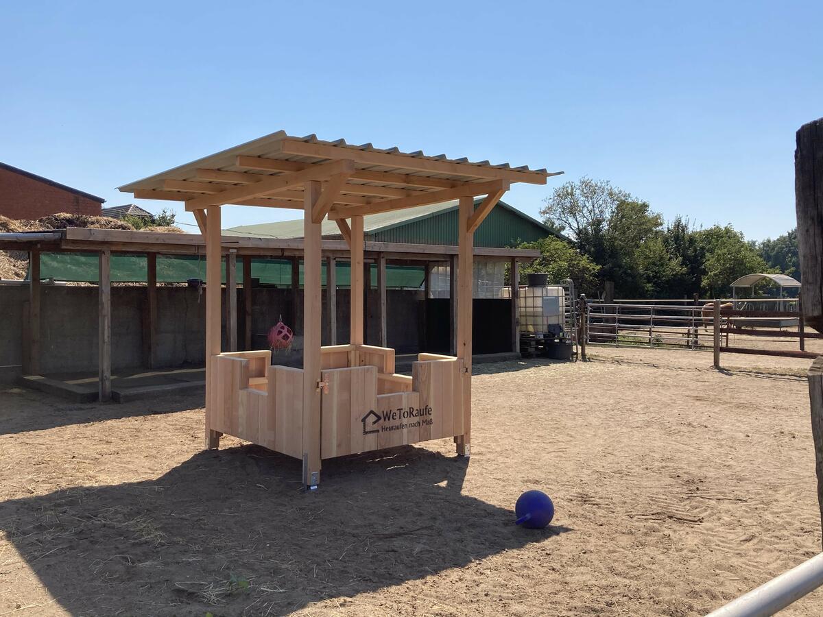 - Unterstand (42 qm) mit Heuraufe und Windschutznetz von „WeToRaufe“