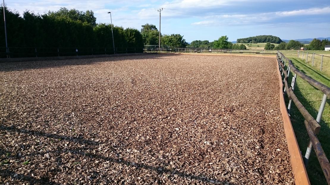 Ein beleuchteter Reitplatz mit Lava Belag und ein idyllisches Reitgelände (ca. 150-400 m ab Stall bis zum Waldrand) sind vorhanden.