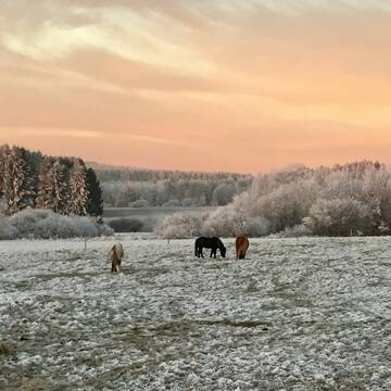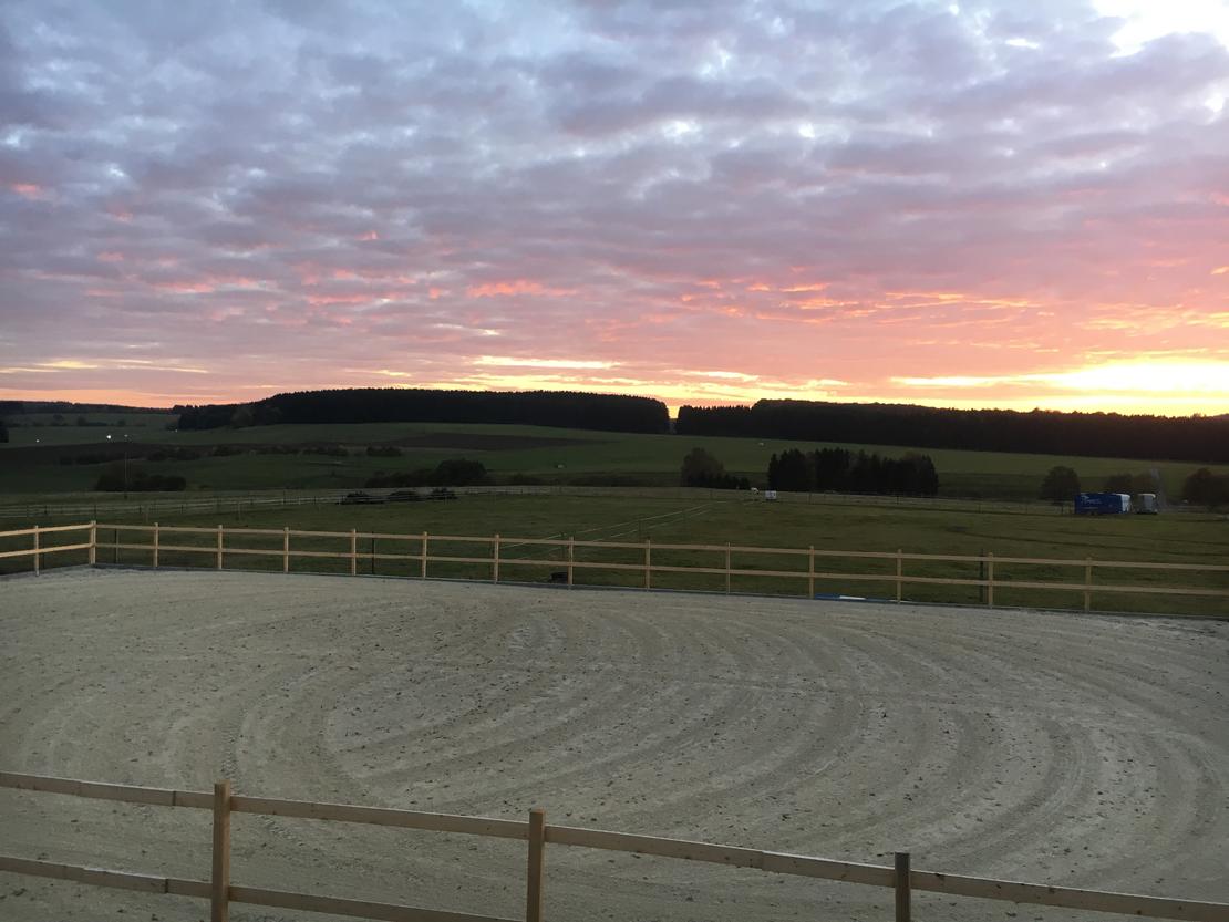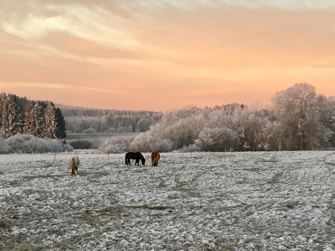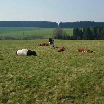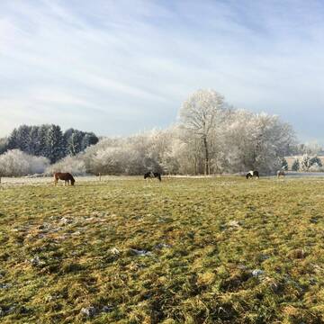 Im Sommer laufen unsere Pferde täglich auf die direkt am Hof liegenden, sehr gepflegten ca. 20ha aroundierten Weiden und erhalten auf dem Paddock zusätzlich Raufutter oder bleiben 24 Stunden draußen. Im Winter steht unseren Pferden ebenfalls hochwertiges Raufutter (Heu und Heulag) zur Verfügung. Die schönen Offenställe werden mit Strohpellets eingestreut (Staubarm), sind mit Lecksteinen ausgestattet, werden täglich gesäubert, überprüft und auch die Weiden unterziehen wir einer täglichen Kontrolle und regelmäßiger Weidepflege. Unsere Boxen sind zudem alle Videoüberwacht. Neben einem wunderbaren und abwechslungsreichen Ausreitgelände stehen ein Reitplatz, Longier- Reitzelt, Führanlage, Vibrationsplatte, Solarium, Inhalationskammer sowie eine Ovalbahn zur Verfügung. Außerdem bieten wir natürlich genügend Putzplätze (überdacht und beleuchtet), einen Waschplatz, eine Sattel- und Futterkammer sowie ein tolles Reiterstübchen für gemütliche Pausen oder Schulungen. Auch Reitunterricht am Hof - auf Lehrpferden oder mit dem eigenen Pferd - ist jederzeit gerne möglich.