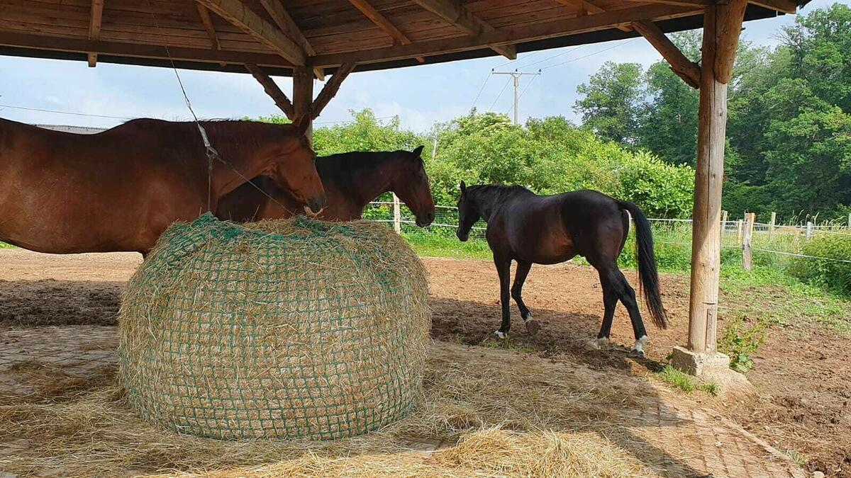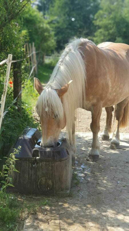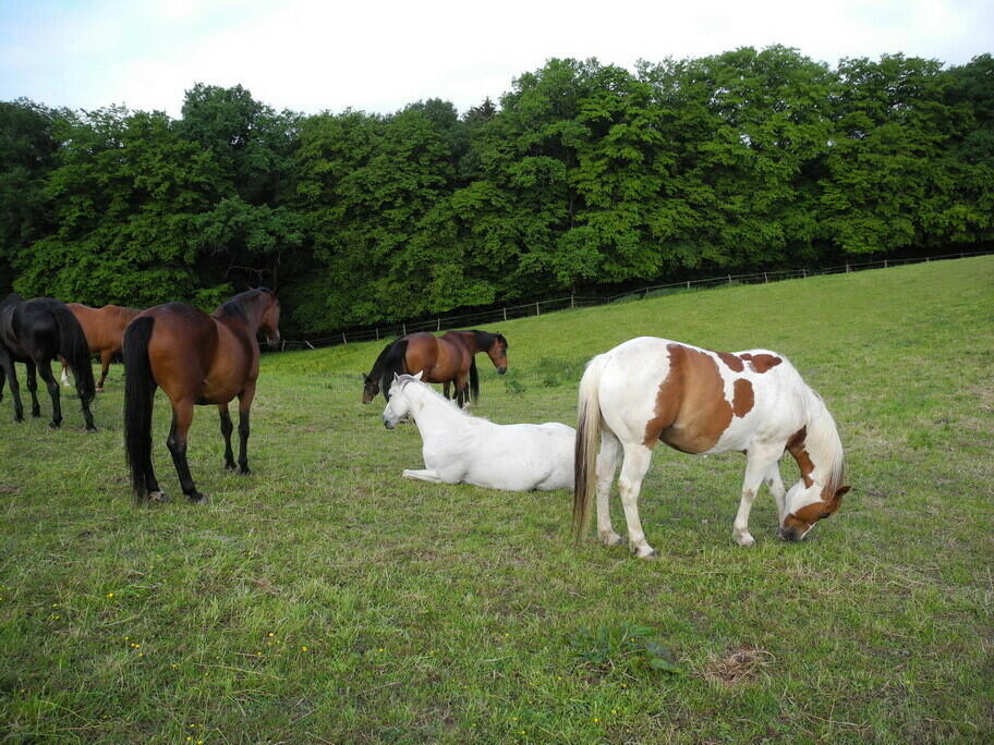 Die Herde hat ganzjährig Zugang zum überdachten Buffet mit selbst gewonnenem Heu und Stroh, lose und in engmaschigen Heunetzen; zur Schlafhalle (35X15), auf den teilbefestigten Paddock und auf ausgedehnte Weideflächen mit Wellnessstation und Waldbestand, die über verschiedene Wege zu erreichen sind. Alle Wiesen sind arroundiert und direkt vom Hof erreichbar. Bei Wiesen, die durch einen öffentlichen Weg abgetrennt sind, stehen ausgedehnte Waldflächen als Schattenplätze zur Verfügung. Durch diese Haltung ist ein Maximum an freier Bewegung gewährleistet und für Abwechslung gesorgt. Selbst unsere Haflinger und Tinker haben Normalgewicht ;-) Für ständig sauberes und kühles Wasser im Sommer und frostfreies Wasser im Winter sorgt eine Balltränke, die von allen Pferden gerne genutzt wird. Neue Pferde werden sorgfältig daran gewöhnt und am Anfang bei Bedarf täglich mit dem Eimer nachgetränkt. Unser Hof liegt direkt am Wald und ist von Weiden umgeben. Wunderschönes Ausreitgelände beginnt direkt hinter der Stalltür. Für das Training stehen ein Reitplatz mit Kirchhellener Sand (20X40), ein Piccadero (11X11) und die Ruhehalle ( eingeschränkt ) zur Verfügung
