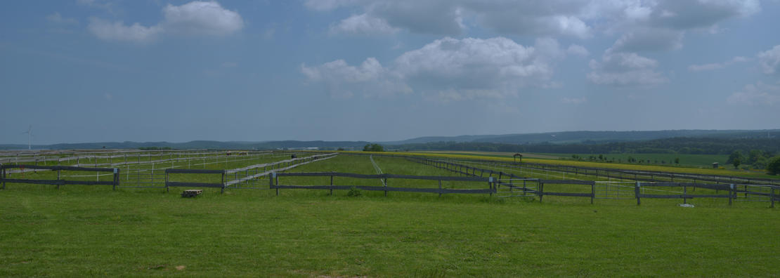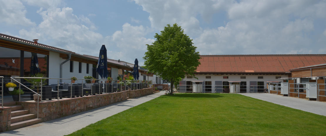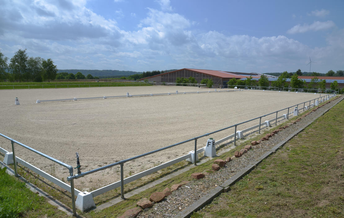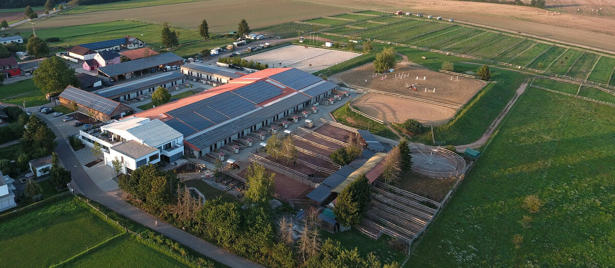 Insgesamt stehen 55 große Paddockboxen (je Box ca. 35m²), 11 Aussenboxen à 13,5m², ein Offenstallbereich für 5-6 Kleingruppen von je 2-4 Pferden, Hengstboxen, Gastboxen und Quarantäneboxen, sowie ein separater Schulpferdetrakt zur Verfügung. Allen Pferden steht Heu als Dauergabe zur Verfügung, Kraftfutter wird individuell über Einzelautomaten pro Box in stündlichen kleinen Portionen gefüttert. Die Boxen sind so konzipiert, dass die Pferde ausreichend Sozialkontakte pflegen können, gleichzeitig aber auch Ruhe- und Rückzugsbereiche haben. Die Boxen sind vollständig mit Gummi ausgelegt und mit Allspan eingestreut, die Paddockflächen haben einen aufwändigen Aufbau mit TTE-Paddockplatten inkl. 50 cm Unterbau, eingestreut mit Hackschnitzeln und Sand. Im Herzen der Anlage liegt die große Halle, lichtdurchflutet und optimal belüftet mit hochmoderner LED-Technik, Berieselungsanlage, vollverspiegelter kurzer Seite und einem Maß von 25 x 60m. Ebenso eine kleine Halle zum Trainieren und longieren von 20 x 30m, dazwischen liegt im zusammenhängenden Gebäudekomplex ein zentraler Putzbereich mit beheizten Sattelkammern, Solarium, Waschplatz, etc. An der großen Halle liegt die Hof-Reitstube mit Blick in die Halle und den Innenhof, gemütlich im Vintage-Stil gehalten mit mediterraner Sonnenterrasse und guter Küche. Um den Innenhof herum liegen 3 weitere Stalltrakte mit zusätzlichen dezentralen Putzbereichen, Solarien etc. Im Außenbereich steht ein Großer Dressur und Springplatz zur Verfügung, der mit den Maßen von 58 x 68m Platz für zwei 60er Vierecke oder einen großzügigen Parcours bietet. Daneben befindet sich ein weiterer Trainings- und Springplatz mit ca. 5500m², festen Hindernissen, Auf- und Abritten , der auch einen separaten zusätzlichen Longierplatz beinhaltet. Es stehen zudem 5 große ganzjährige Laufpaddocks mit 75m Länge zur Verfügung, 27 einzelne (je 2-3 Pferde) Sommerkoppeln und eine Winterkoppel mit ca. 10 000m² Fläche zur Verfügung, ein Umritt um die Koppeln mit weiteren Auf- und Abritten sowie eine Teichanlage mit Ein- und Ausprung/Durchreitmöglichkeiten auf einem Rundweg von ca. 1,5km Länge in eingezäuntem Bereich, ein horse-gYM 2000 Laufband sowie die geplante Führanlage, wunderschöne, direkt angrenzende Ausreitwege in den Pfälzer Wald, uvm. gewährleisten den Pferden ganzjährig optimale Bewegungsmöglichkeiten. Wir bieten in unserer Hof Reitschule Anfängerunterricht, darüber hinaus zahlreiche Möglichkeiten für Fortgeschrittene, hochqualifizierte Beritt- und Unterrichtsmöglichkeiten, auch durch bekannte externe Trainer für Dressur-, Springen-, Freizeit- und Westernreiter mehrfach in der Woche, zusätzliche Seminare, Abzeichenlehrgänge etc. runden das Angebot ab. Bei uns zählen alle Pferde gleich und sind gleichermaßen herzlich willkommen, egal ob Pony, Großpferd, Sporttalent, Jungpferd, Oldie oder Sonderrassen, „aus der Verantwortung des Menschen für das Tier als Mitgeschöpf, dessen Leben und Wohlbefinden zu schützen (§1 Satz 1 TierSchG). Darauf verpflichten sich alle Einsteller, Pferdebesitzer, Vereinsmitglieder, Gäste und Nutzer der gesamten Reitanlage.