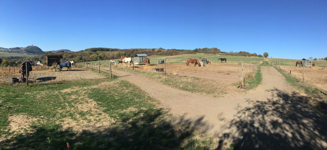 Aktivstall "Wallach"Insgesamt 8 Wallachplätze bieten wir im Aktivstall an. Die Tiere stehen 24/7 draußen - das ganze Jahr. Es gibt eine Liegehalle (16m x 5m), ein großes Winterpaddock und insgesamt 4,2 ha Weidefläche. |