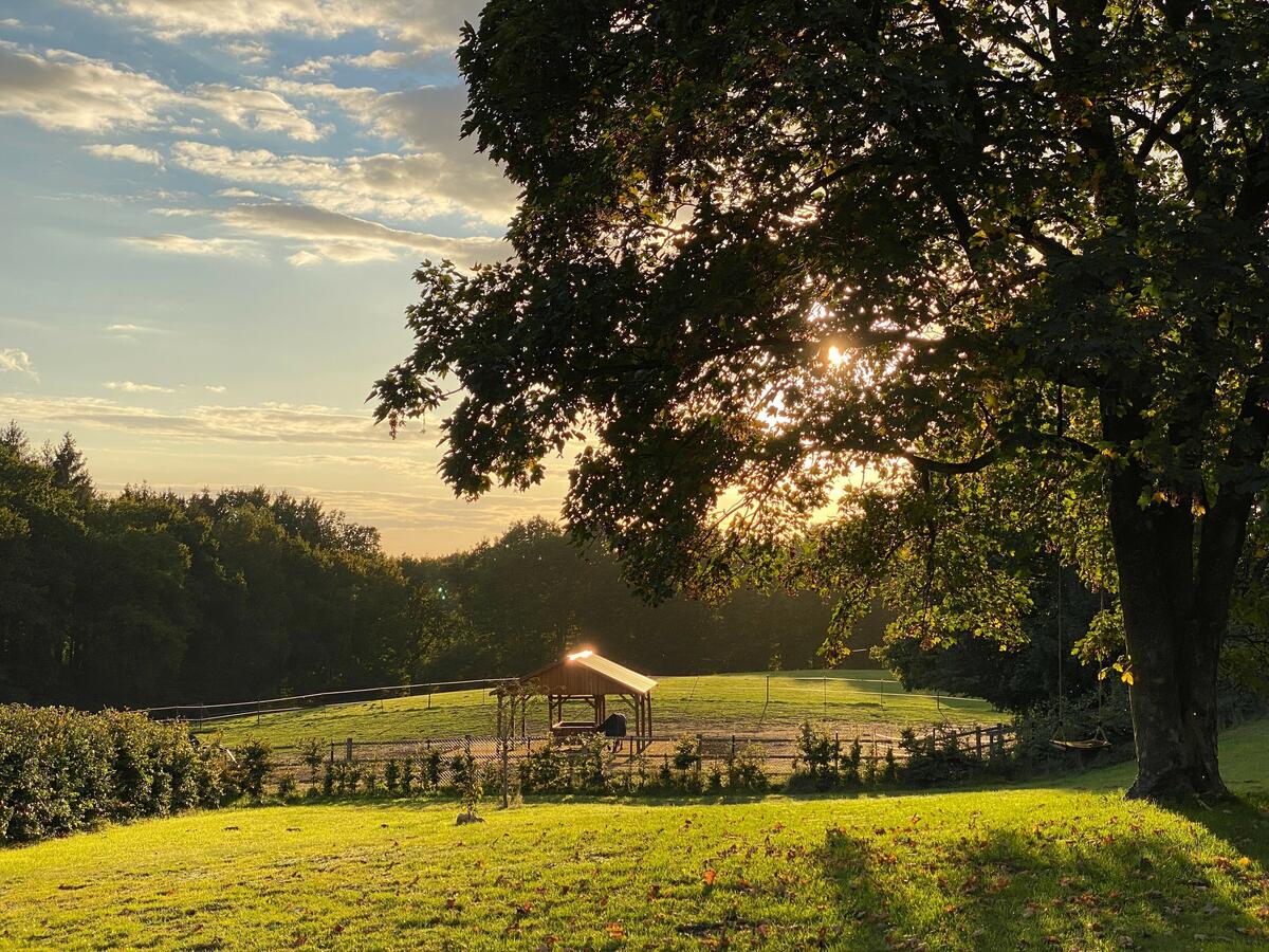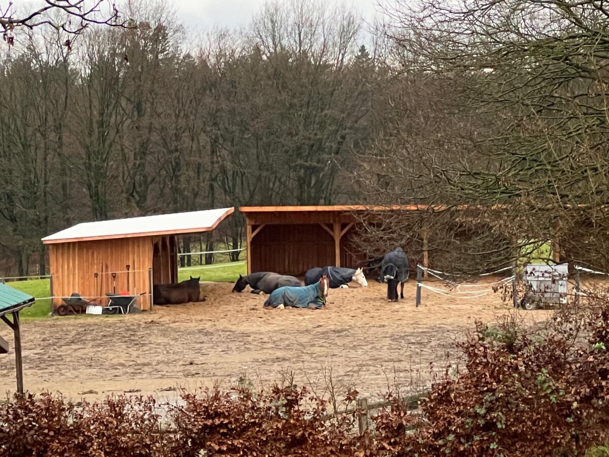 einfacher Wallach-Trail-PlatzWir haben für Wallache einen eigenen Bewegungs-Trail, mit zwei Weidehütten und 4 Holzraufen. Hochwertiges Heu ist immer vorhanden. Und viele Bewegungsanreize gibt es durch das Trail-Konzept. Sämtlicher Luxus der hochwertigen Reitanlage steht zur Verfügung (Reithalle, Außenreitplatz, Naturspringplatz, Solarium, Galoppbahn usw) |