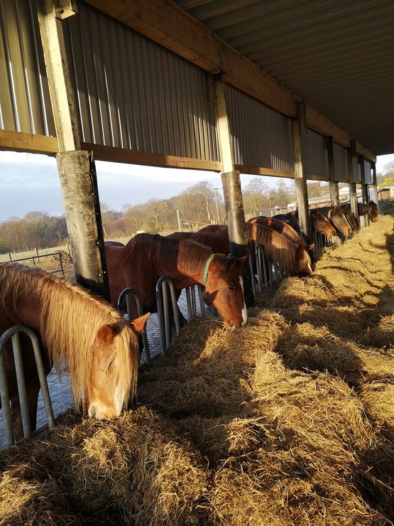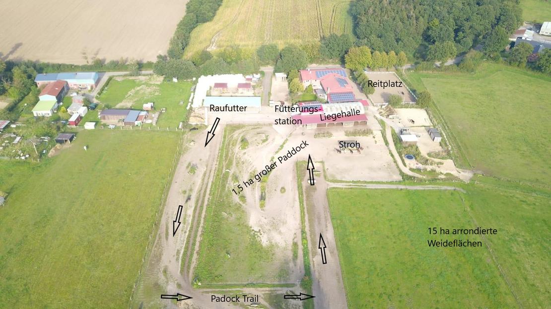 Das Platzangebot ist hierbei besonders wichtig. Stress entsteht oft, wenn einer Herde zu wenig Fläche zur Verfügung gestellt wird. Im Hauptpaddock mit einer Fläche von 1,5 ha sind die überdachten Ruhebereiche (470 m²), Tränken und Strohraufen. Von dort aus gelangen die Pferde durch die Futterstation je nach Einstellung auf insg. fast 16 ha arrondiertes Weideland. Auch im Winter werden Weideflächen hinzu gegeben, wenn am Futtergang Heulage (aus eigenem Anbau) vorliegt. Auch hier kann durch die Zutritte der Futterkonsum individuell eingestellt werden.
