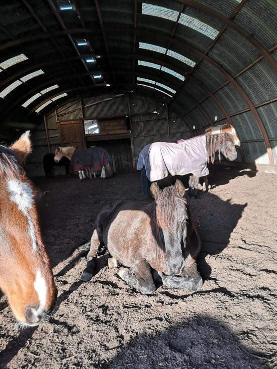 Außerdem haben wir einen Laufstall für Kleingruppen gebaut, für die Pferde, die nicht oder vorübergehend nicht in der großen Herde gehalten werden können.