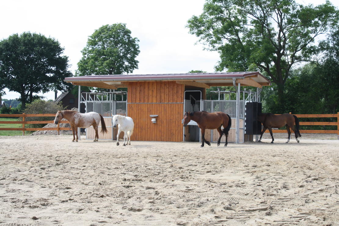 Im kleinen Offenstall haben die Pferde im Sommer 24 Stunden Weidezugang. Zusätzlich steht ihnen eine Raufe mit Heu ad libitum ganzjährig zur Verfügung. Die mit Stroh eingestreute Liegehalle wird gerne genutzt.