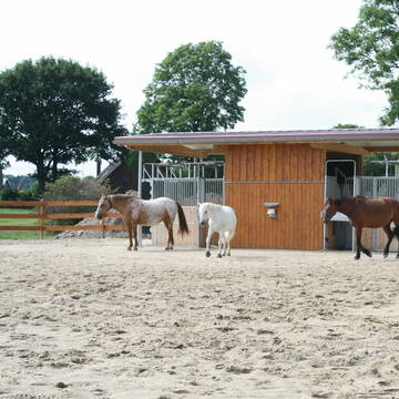 Unser Wallach-Boxenstall beinhaltet 13 Außenboxen. In den Sommermonaten kommen die Pferde tagsüber auf die Koppel, in den Wintermonaten auf das gemeinschaftliche, große Paddock.
