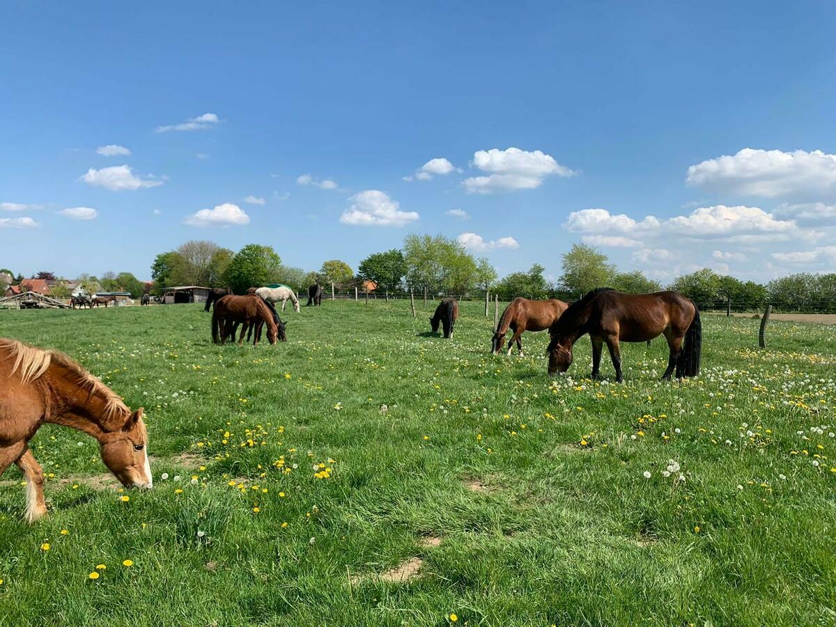 Die Pferde können im Sommer tagsüber, nach sehr langsamer Anweidung und Nachweis von Wurmfreiheit auf gepflegte Weiden, bis zu 8 Std gehen. Die Wiesen sowie Paddocks werden tgl von den Exkrementen der Pferde gesäubert, kein Weidegang ebenfalls möglich, Pferden stehen dann im Herdenverband auf dem Paddock.