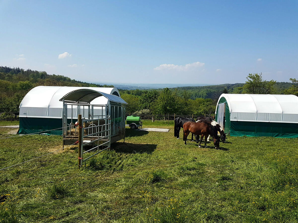 Wir haben das Wohl der Pferde in den Vordergrund gestellt: • 2 Gruppen auf über 5ha Weidefläche • 2 große Sommerweiden zum Wechseln, Mai-Oktober • Winterweide mit 3 Bereichen (einer davon befestigt), November – April • Top moderne Weidezelte – kühl im Sommer und witterungsbeständig im Winter • tägliche Kontrolle • Frisches Wasser - im Spezialfass: im Sommer kühl und Algenfrei / im Winter kann es nicht einfrieren • Heuraufe – immer zugängig mit Bio-Heu aus eigenem Anbau! • Salzlecksteine • um das Koppel abmisten kümmern wir uns • zum Putzen und Füttern steht Platz in einer Schleuse bereit, dort kann dann auch der Tierarzt oder Hufschmied kommen. • Für das Putzzeug, Decken, Halfter, etc. stellen wir einen abschließbaren Wagen bereit.